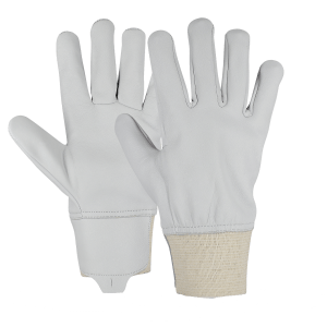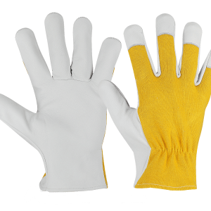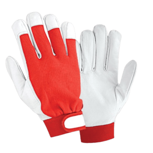Red Cotton Lycra Rib back with Natural color goat leather palm & index finger Elastic band wrist, Mechanical values 2121X